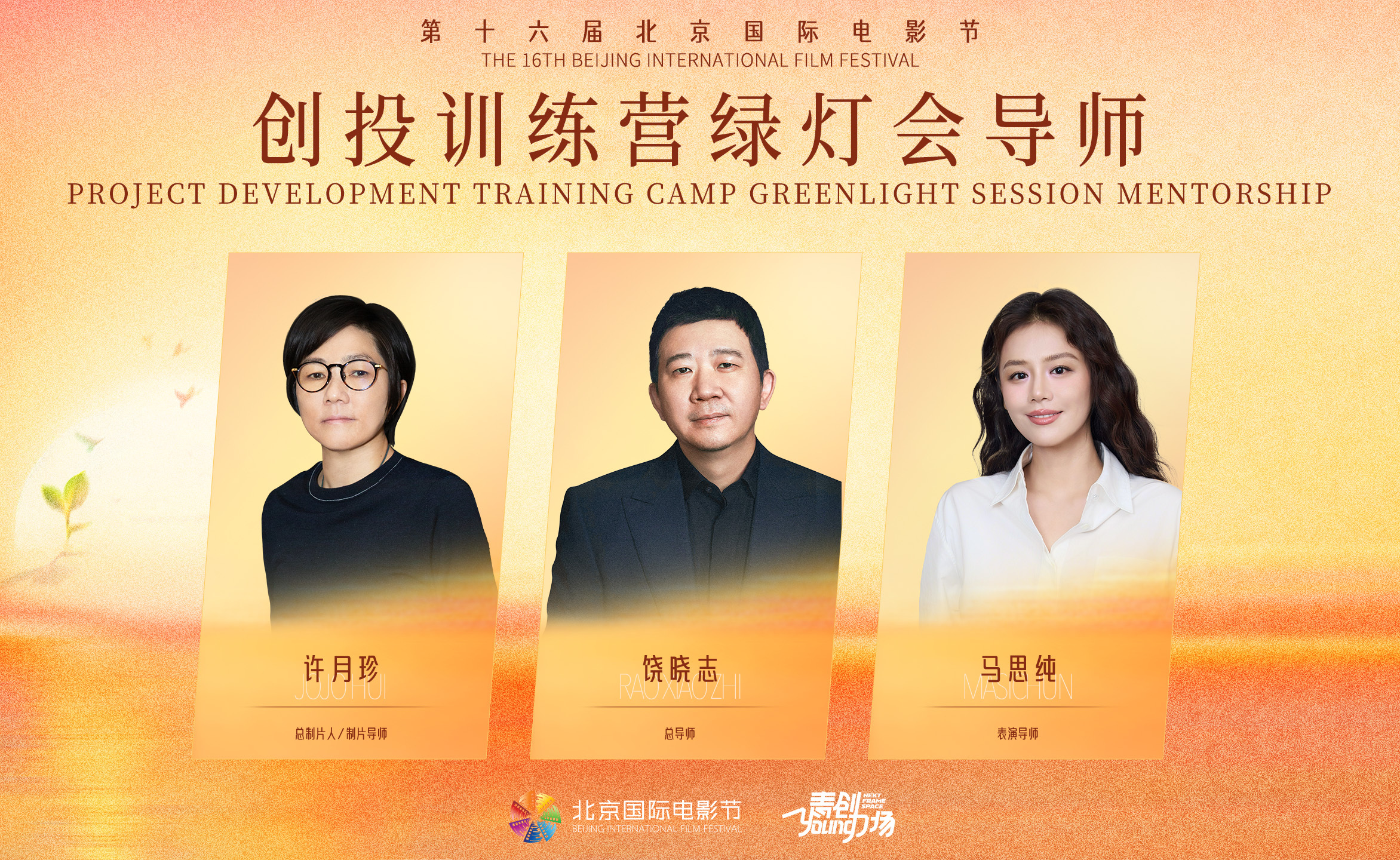 本届创投训练营由总导师饶晓志、制片导师、总制片人许月珍、表演导师马思纯领衔,10位活跃在创作一线的训练营导师团完成终选实拍短片的筛选工作。4部短片现已拍摄完毕,并进入后期制作阶段,将在本届北影节期间进行首映。2026青年导演推介盛典将遴选出6-8部即将上映的青年导演电影作品进行集中推荐。