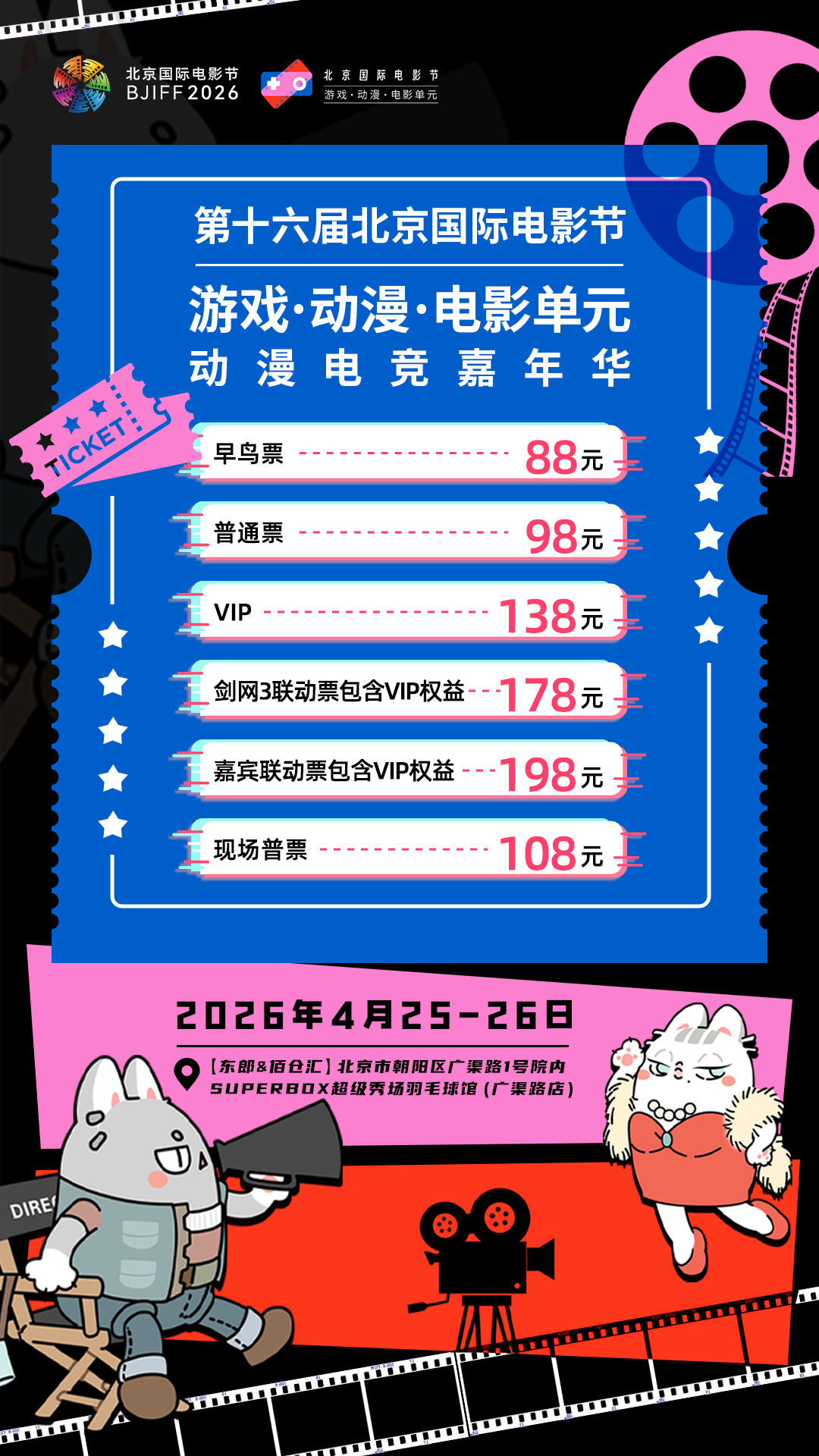 本次动漫电竞嘉年华由北京国际电影节组委会办公室、北京市广电局、北京电影协会、北京市电子竞技产业发展协会指导,北京春江暖文化传播有限公司主办,将落地北京市朝阳区广渠路1号院祥龙·佰仓汇园区内SUPERBOX超级秀场羽毛球馆。当电影的艺术光影邂逅游戏的热血叙事与动漫的浪漫想象,一场史无前例的跨次元文化盛宴即将开启。这不仅仅是一场展览,更是激活文化年轻活力的超级引擎,势必将成为这个春天全民期待的文化地标事件!
