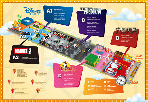 “世界经典动漫明星巡礼”创造了一个愉快且难忘的嘉年华模式,将活动内容与现代高科技相结合,让参与者身临其境,提供高质量的全民互动空间。 在这里,每天都上演着卡通明星见面会。国际五大经典动漫品牌官方授权:迪士尼、漫威、孩之宝旗下变形金刚、三丽鸥旗下Hello Kitty,上海美术电影制片厂旗下大闹天宫。其中包括米奇米妮、蜘蛛侠、钢铁侠、变形金刚、Hello Kitty、孙悟空等。如果你是充满动感英雄梦想的男孩子,那么变形金刚主题区一定是首选,穿上你的盔甲,带上武器,和擎天柱大黄蜂一起并肩战斗;如果你是怀揣公主梦想的女孩子,那么你将在公主拍照区里与公主一起合影!你还可以跟着可爱的Hello Kitty一起去魔法森林的5D电影;要是你更喜欢《大闹天宫》,那么就来这里身临其境地去体验一下美轮美奂的天宫仙境吧!活动期间,大家可以和这些经典卡通人物及故事进行互动,甚至还可以和他们亲密接触。