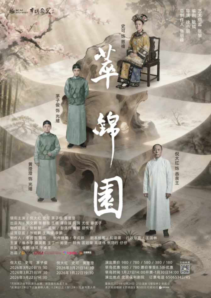 演出时间:2026年3月20日19:30、3月21-22日14:30/19:30 演出地点:北京保利剧院领衔主演:倪大红、史可、茅子俊、黄澄澄(不同场次由不同演员参演)剧情简介:光绪二十四年,春夏之交的京城,风雨欲来。瀛台孤灯映着帝王的焦灼,颐和园的花影藏着权力的暗涌,而什刹海畔的萃锦园,成了晚清命运的关键棋局。萃锦园内,叔侄的私房话藏着家国忧思;卤煮摊前,市井的闲谈映着世事冷暖;紫禁城里,《定国是诏》的颁布点燃变革的烈焰却也引来了雷霆反噬。从变法的热潮到戊戌的血凉,从义和团的喧嚣到八国联军的铁蹄,帝王的抱负、权臣的权衡、百姓的浮沉,都在历史的洪流中交织碰撞。萃锦园的亭台楼阁见证着权力的博弈与理想的幻灭,这是一次对历史的叩问,当江山飘摇,国祚垂危,变法与守成该如何取舍?权力与民心该如何平衡?传统与革新该如何兼容?鸽啃划破天际,老汤卤煮依旧飘香,而那段风雨如磐的岁月,早已在萃锦园的光影流转中,沉淀为永恒的回响。