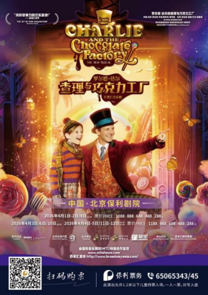 演出时间:2026年4月1日-3日19:30、4月4日-5日14:30/19:30、4月6/8/10日19:30、4月11日-12日14:30/19:30演出地点:北京保利剧院演出团体:百老汇国际集团Broadway International Group剧情简介:改编自罗尔德·达尔的经典小说《查理与巧克力工厂》,音乐剧由Marc Shaiman作曲,Marc Shaiman与ScottWittman共同作词,David Greig撰写剧本。剧中音乐不仅包含原创作品,还向1971年电影版中Leslie Bricusse和Anthony Newley创作的经典曲目致敬,其中包括《糖果大王》《我得到了金奖券》和《纯真幻想》。闻名全球的威利·旺卡即将开启他神秘工厂的大门,但仅限于少数幸运者。年轻的查理和其他四位“金奖券”得主将踏上一场改变人生的旅程,探索旺卡充满奇幻的世界,包括巧克力瀑布、顽皮的松鼠和神奇的玻璃电梯,所有这一切都将在旺卡那群好奇的小矮人工人带领下揭晓。