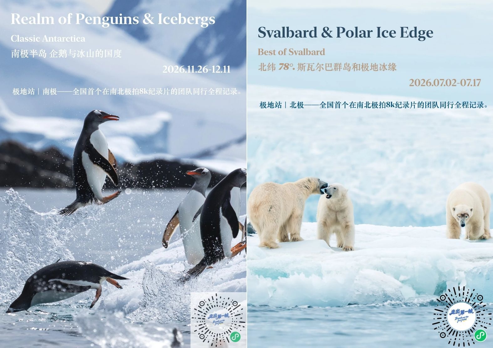 世界尽头不是比远,而是比“稀缺”。在这个人人都有相机的时代,什么样的影像,才配得上世界尽头的孤寂与壮阔?北极与南极窗口期限定航线,避开流水线,我们携手国内第一个在南北极航拍8k纪录片的团队,同行全程记录,在 BBC《冰冻星球》同款取景地,在南极半岛或斯瓦尔巴群岛,专业团队掌镜、无人机全景俯瞰、电影级剪辑,为你定制一份人生“第一帧”。有些地方一辈子只去一次,别让影像留下遗憾。