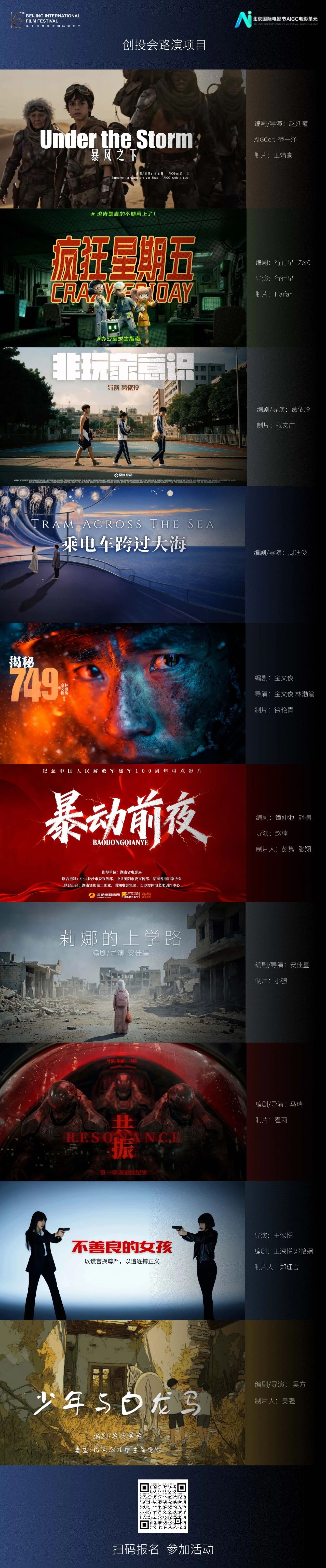 恭喜所有入围团队!你们的每一次尝试,都在推动着人工智能与中国电影产业的深度融合,都在为智能时代的影视创作注入新的活力。感谢大家对第十六届北京国际电影节AIGC电影单元创投会的关注和参与!