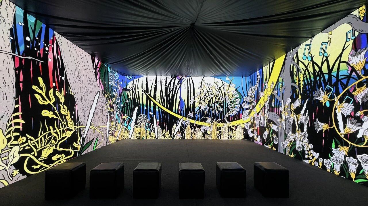 《宇宙花园》是艺术家卜桦多年创作与心灵觉醒的集大成之作。卜桦通过奇妙的色彩和繁茂的植物意象,创造了一个寓意精神世界灵魂世界的广袤宇宙,观众的靠近与行走能触发动植物的跟随与生长等多种交互效果,为观众带来一场“视”“听”“触”“嗅”多重感知的数字沉浸式体验。王泊乔谈到卜桦在创作《宇宙花园》时,核心理念是将私人情感升华为具有共鸣的生命探索。她试图在虚拟的数字空间中重构生命的意义,将个体的心灵觉醒转化为对“生命力”与“自我成长”的宏大叙事。在表现形式上,他强调一种“模糊感”与“穿越感”,不追求生硬的叙事逻辑,而是通过视听与感官的协同,引导观众在一种半梦半醒的沉浸状态中,从自我的“小花园”走向心胸开阔的“大宇宙”,传递出“心中有便有宇宙”的豁达与治愈力量。通过cave空间的沉浸式展览方式将观众包围其中,强调观众的在场,通过多觉唤起观众的情感共鸣,能产生手机或电脑屏幕无法模拟的深度体验。